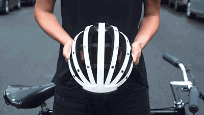 這款頭盔采用了可活動(dòng)的骨架組成主體,骨架之間使用尼龍繩連接,騎行的時(shí)候戴在頭上。下了車(chē),可以輕松的把它折疊起來(lái)。折疊后只有 9.2 厘米厚,放進(jìn)包里很輕松。