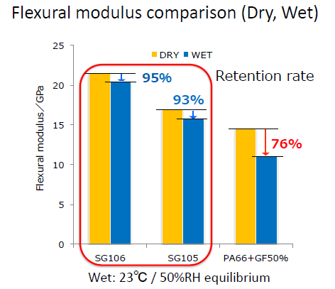 在下圖中,可以看到最新的SG106和SG105,分別是 60%和 50%玻璃纖維增強(qiáng)PA66復(fù)合材料,其彎曲模量在干態(tài)和濕態(tài)的變化中,保持率在 90%以上,而我們標(biāo)準(zhǔn)的PA66+50%玻璃纖維,剛性保持率卻只有 76%,除了性能區(qū)別之外,在VOC和磨耗性能方面,新牌號(hào)都帶來(lái)了新的變化,該產(chǎn)品也被定義為汽車內(nèi)飾以塑代鋼專用材料。