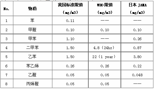 《指南》規(guī)定了車內(nèi)空氣中苯、甲苯、二甲苯、乙苯、苯乙烯、甲醛、乙醛、丙烯醛的濃度要求,與世界衛(wèi)生組織(WHO)及日本汽車工業(yè)協(xié)會(JAMA)限值的對比情況見表1所示。
